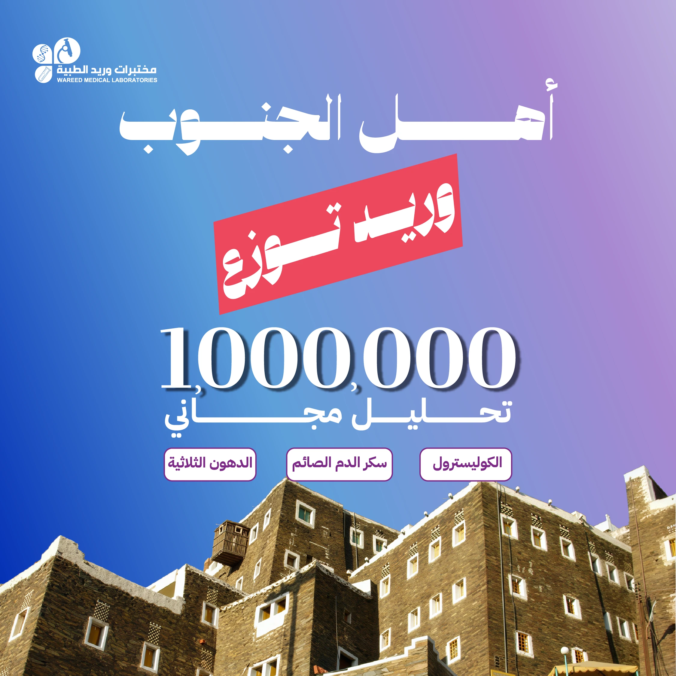 يا أهل الجنوب، مختبرات وريد الطبية وصلتكم لتكون أقرب إليكم بخدمات مخبرية دقيقة ونتائج سريعة وكادر طبي متخصص. سارعوا الآن بالتسجيل والاستفادة من 3 تحاليل مجانية ضمن مبادرة مختبرات وريد مع صحتي لدعم الصحة الوقائية. كما يمكنكم الدخول في السحب على سبائك ذهبية، بالإضافة إلى فرصة الفوز في السحب الكبير على 4 سيارات.
