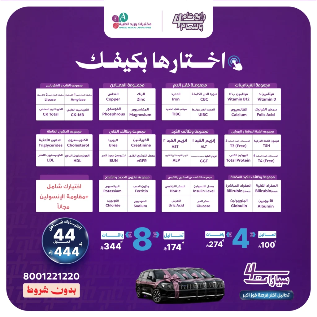 بمناسبة تأسيس وريد، نقدم لك الإختيار الشامل لتقييم صحتك بدقة، يشمل 44 تحليلًا مهمًا لمختلف وظائف الجسم، مع تحليل مقاومة الإنسولين مجانًا لتعزيز الرعاية الصحية المتكاملة.
