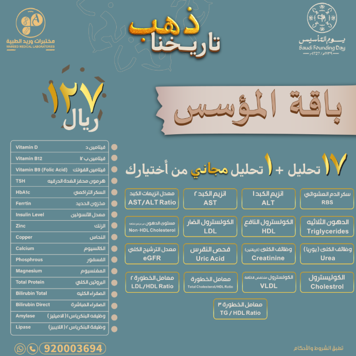 بمناسبة يوم التأسيس، نقدم لكم باقة صحية شاملة تهدف إلى الاطمئنان على أهم مؤشرات الصحة العامة، ضمن عرض مميز بسعر خاص. باقة “المؤسس” صممت لتغطي تحاليل الدم الأساسية، وظائف الأعضاء، الدهون، الفيتامينات والمعادن، لتمنحك صورة متكاملة عن حالتك الصحية بكل دقة وموثوقية