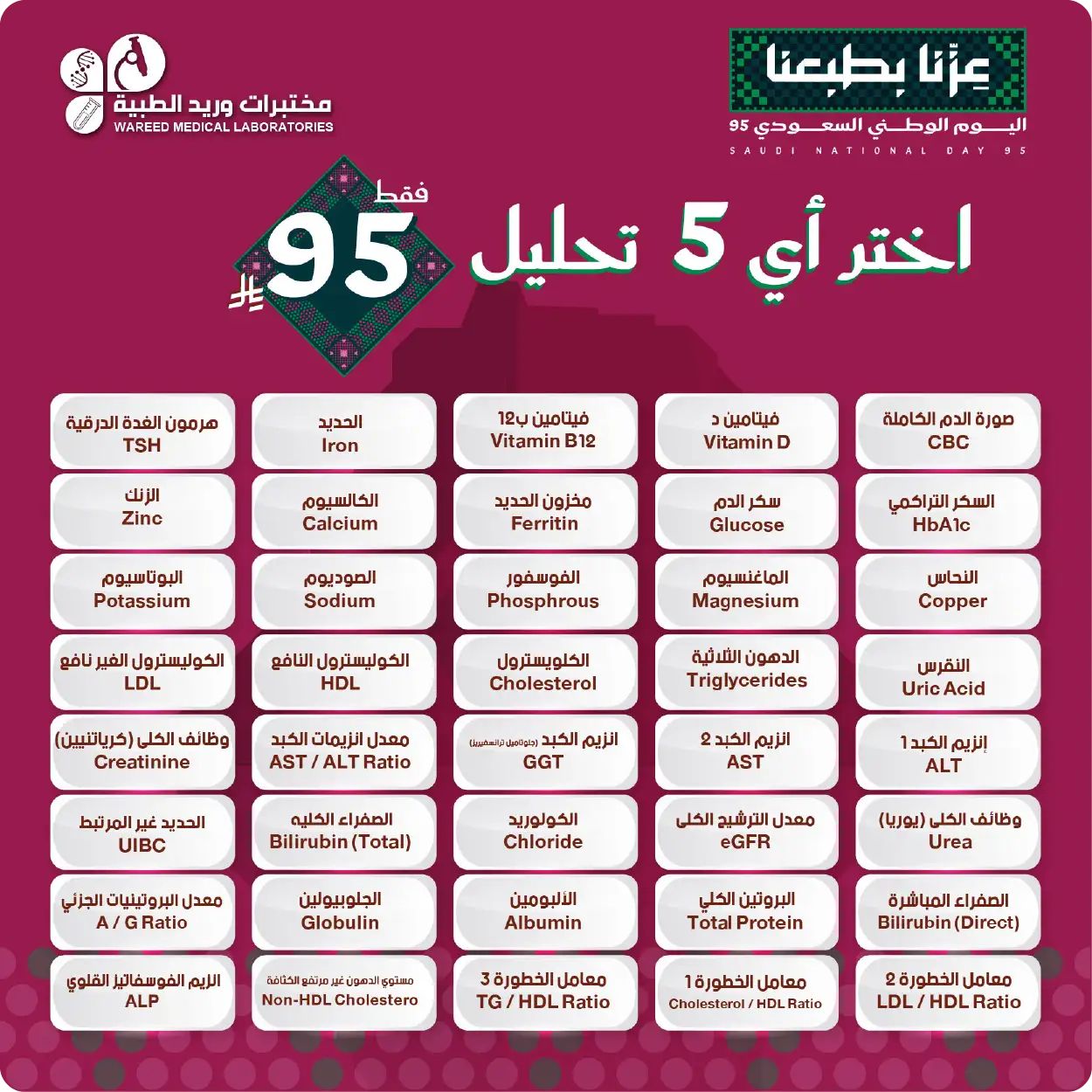 باقة الخمسة تحاليل تتيح لك اختيار 5 تحاليل طبية مقابل 95 ريالًا فقط، حسب احتياجاتك الصحية مثل السكر، الدهون أو الفيتامينات، مع دقة عالية ونتائج سريعة.