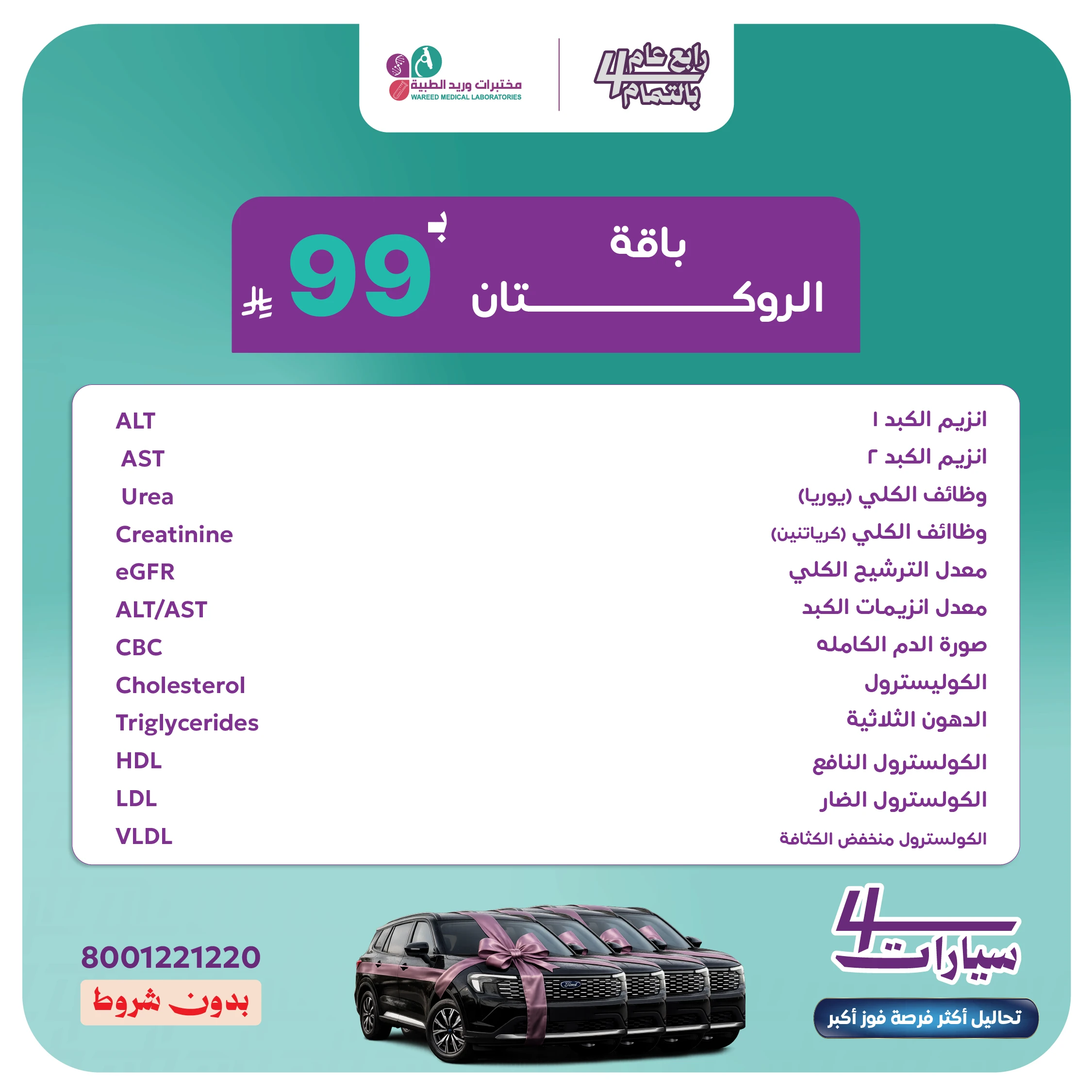 صُممت باقة تحاليل الروكتان لمتابعة صحة الجسم أثناء علاج الروكتان، من خلال مراقبة وظائف الكبد والكلى ونِسَب الدهون في الدم، لضمان سلامة العلاج والكشف المبكر عن أي تغيّرات قد تؤثر على صحتك.