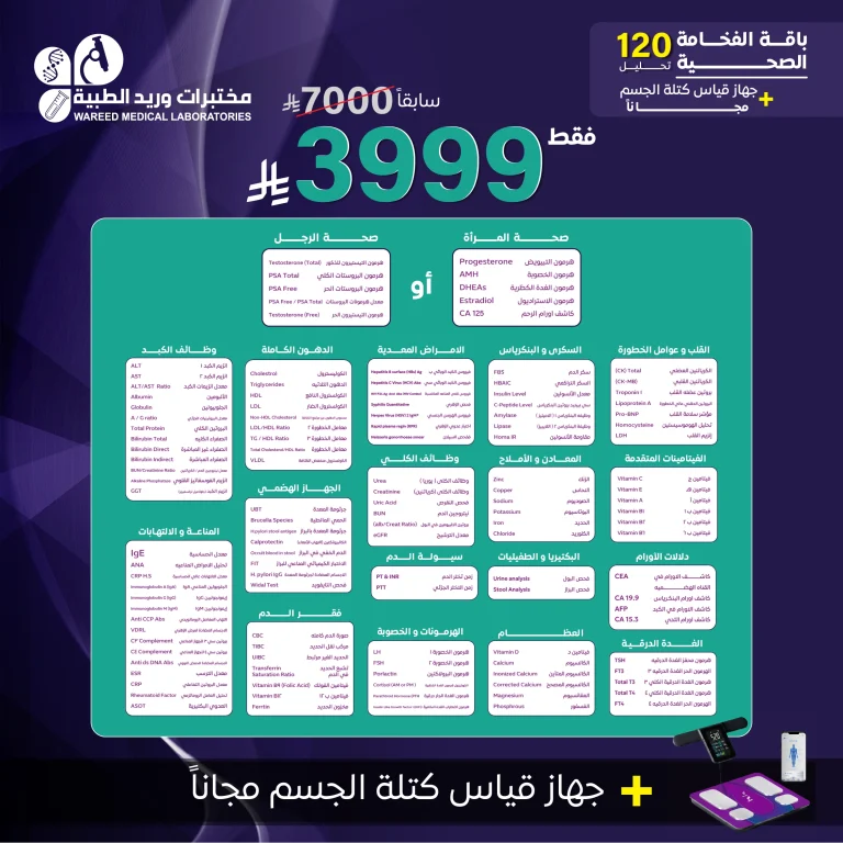 باقة الفخامة الصحية تقدم لك فحص شامل لكل وظائف الجسم الأساسية، من الدم والكبد والكلى والهرمونات والمناعة والعظام والقلب.. ومع باقة الفخامة الصحية تحصل على جهاز   لقياس كتلة الجسم مجانًا بدقة عالية،